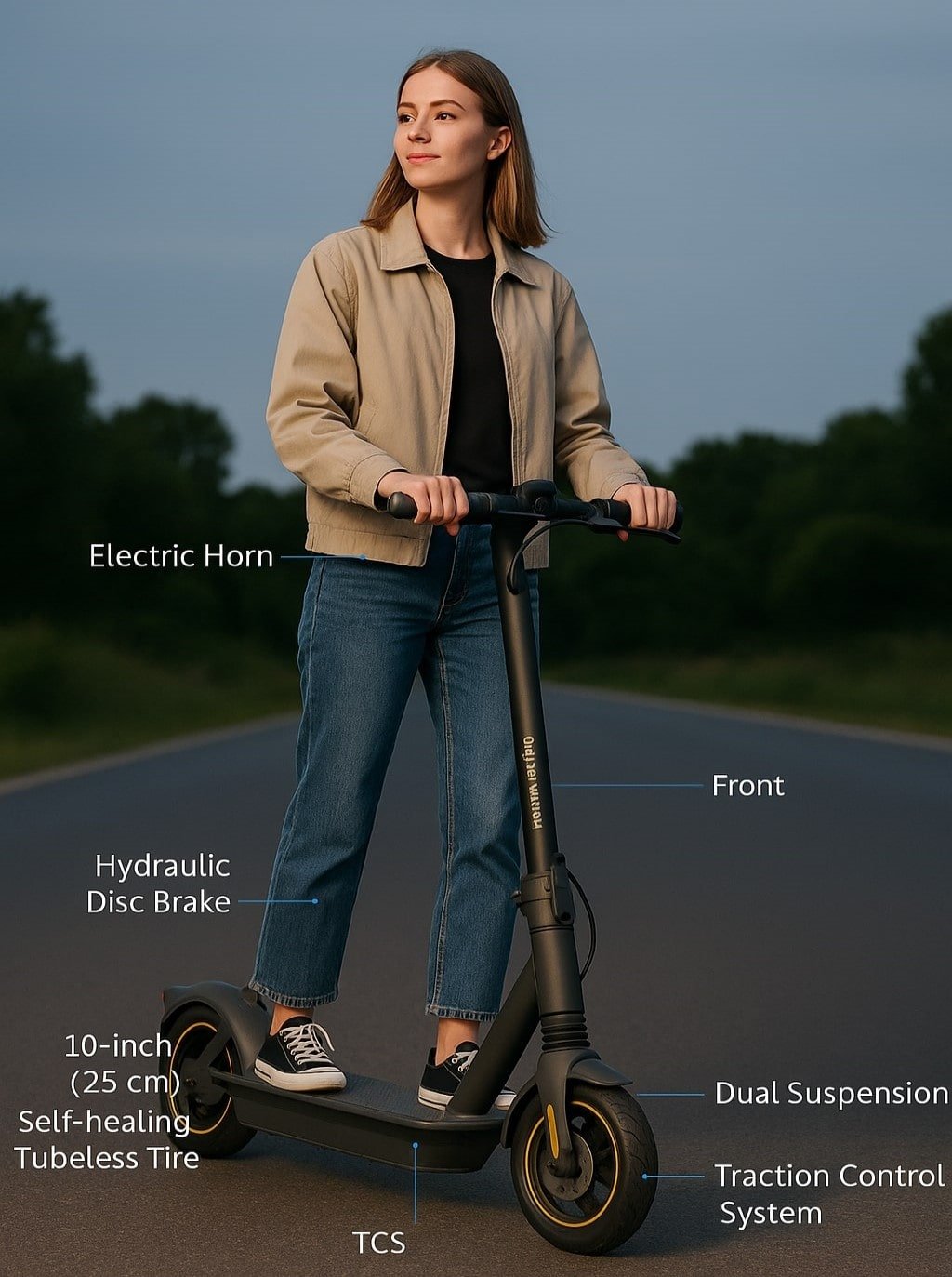 10-Zoll-Reifen und das etwas gröĂere Fahrgestell sorgen fĂŒr ein ruhigeres, erwachseneres FahrgefĂŒhl als viele gĂŒnstigere 8-Zoll-Roller, insbesondere auf unebenen Radwegen.